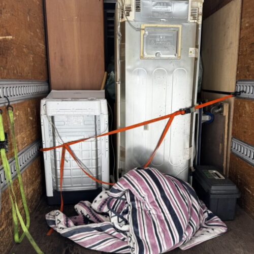 階段が比較的広い作りだったのは幸いでしたが、重い洗濯機や食器棚を運ぶ際は階段の段差に注意しながら、壁や手すりを傷つけないよう丁寧に回収!