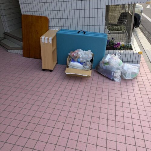 お住まいはエレベーターのないアパートの3階。テーブルやクーラーボックスは少し重みがあり、階段の搬出に注意が必要でしたが、壁や手すりを傷つけないよう毛布で保護しながら慎重に運び下ろし回収しました!!